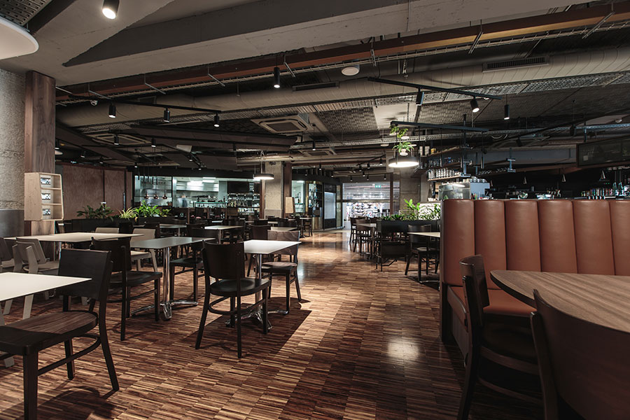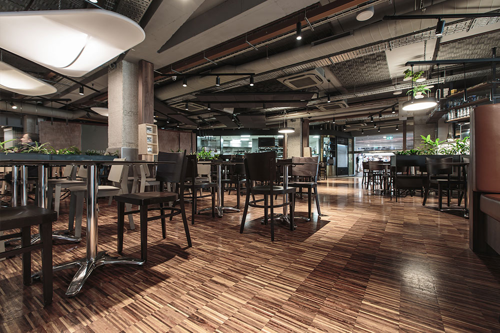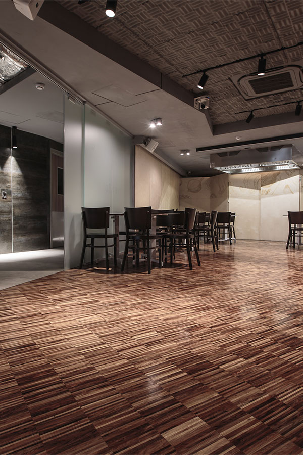 S.A.W. Ltd. supplied the industrial style flooring 14mm solid industrial walnut parquet strips sanded and finished onsite. Carob Tree was designed by Demicoli and Associates.