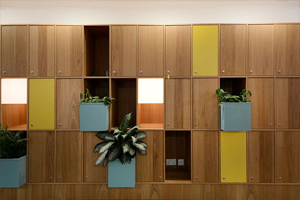 For this innovative and unique project, we have created timber entrance door, timber internal doors, reception desk, bathroom units, kitchenette, lockers, timber ceiling with mesh, desk planters, grille unit, cupboard unit, merchandise display, ambassador desk, payment desk and the bar.