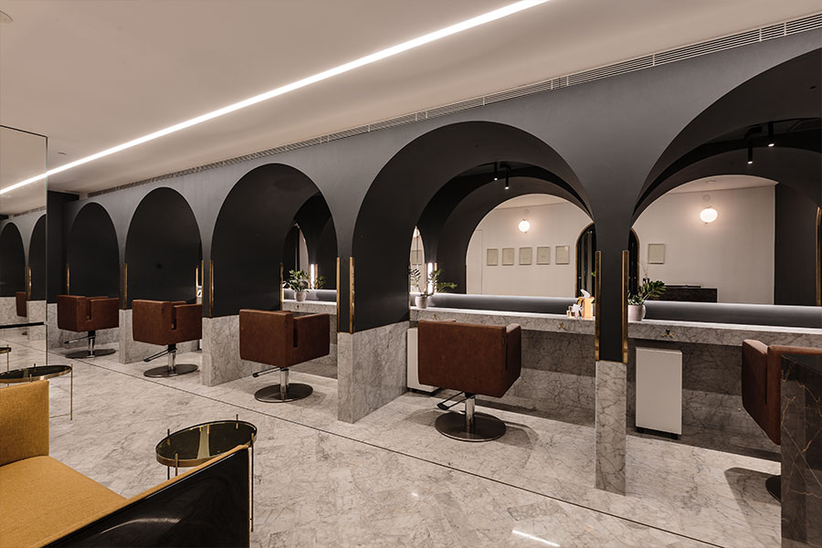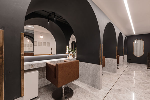 The main salon space was designed around five stations which occupy the length of the space, providing the salons predominant aesthetic - the arches mimicking the hotels iconic entrance portico whilst allowing the stylists to work within their own defined space and provide an intimate one-on-one service to their patrons. Stations offer the required privacy, whilst allowing glances towards their neighbours through the large mirror, running across station to station.