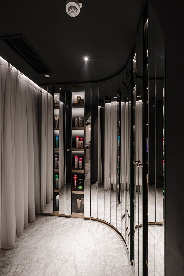 The small space was subdivided into zones flowing from one to another, creating a guiding path through the salon. A narrow corridor space (previously designed to accommodate a large back of house) was re-purposed to accommodate the darkened entrance hall, product display area, an ante-room, sanitary facilities, and a staff/storage room.